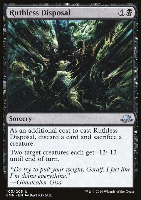 As an additional cost to cast this spell, discard a card and sacrifice a creature. Two target creatures each get -13/-13 until end of turn.