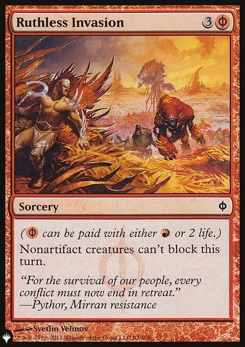 ({R/P} can be paid with either {R} or 2 life.) Nonartifact creatures can't block this turn.