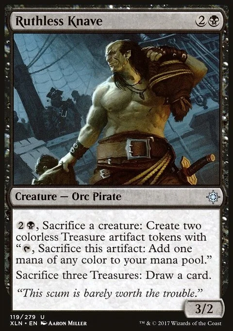{2}{B}, Sacrifice a creature: Create two Treasure tokens. (They're artifacts with "{T}, Sacrifice this artifact: Add one mana of any color.") Sacrifice three Treasures: Draw a card.