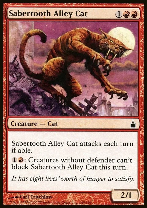 Sabertooth Alley Cat attacks each combat if able. {1}{R}: Creatures without defender can't block Sabertooth Alley Cat this turn.