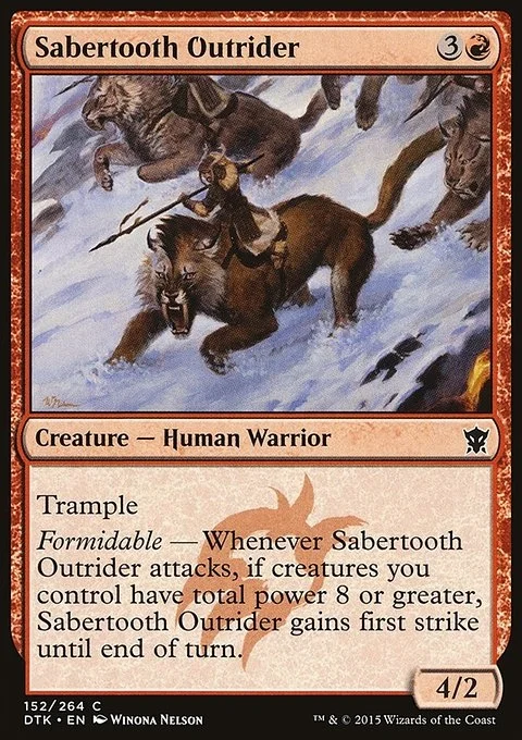 Trample Formidable — Whenever Sabertooth Outrider attacks, if creatures you control have total power 8 or greater, Sabertooth Outrider gains first strike until end of turn.