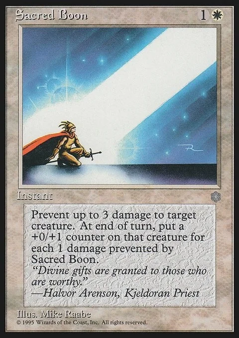 Prevent up to 3 damage to target creature. At end of turn, put a +0/+1 counter on that creature for each 1 damage prevented by Sacred Boon.