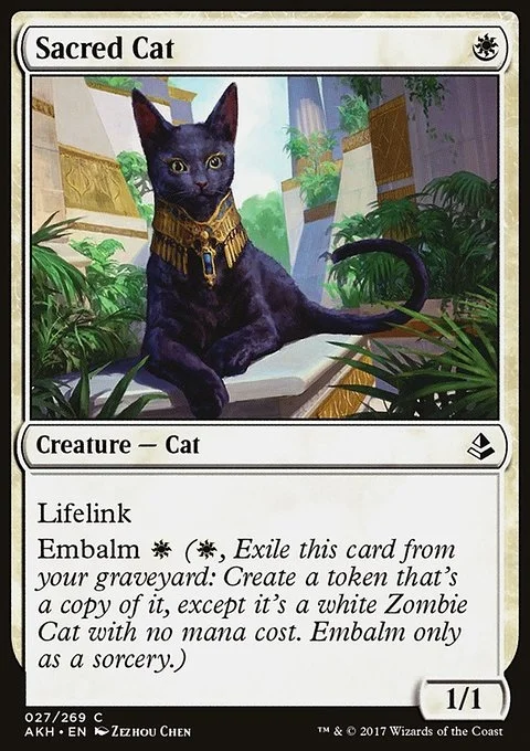Lifelink Embalm {W} ({W}, Exile this card from your graveyard: Create a token that's a copy of it, except it's a white Zombie Cat with no mana cost. Embalm only as a sorcery.)