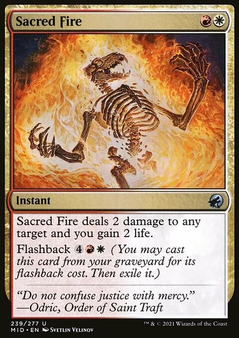 Sacred Fire deals 2 damage to any target and you gain 2 life. Flashback {4}{R}{W} (You may cast this card from your graveyard for its flashback cost. Then exile it.)