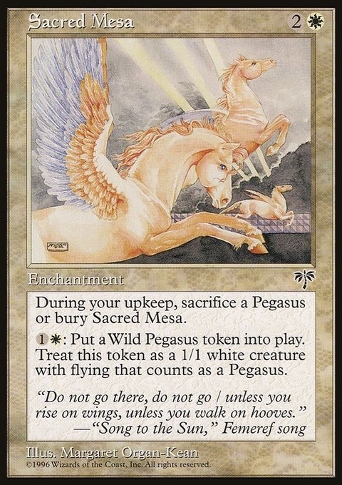 During your upkeep, sacrifice a Pegasus or bury Sacred Mesa.1W: Put a Wild Pegasus token into play. Treat this token as a 1/1 white creature with flying that counts as a Pegasus.
