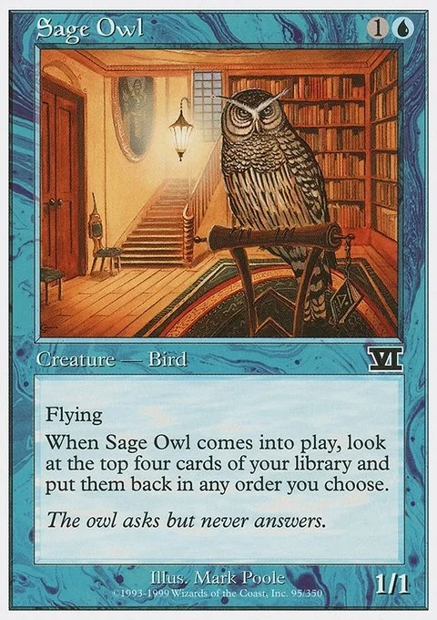 Flying When Sage Owl enters the battlefield, look at the top four cards of your library, then put them back in any order.