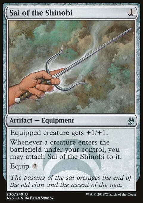 Equipped creature gets +1/+1. Whenever a creature enters the battlefield under your control, you may attach Sai of the Shinobi to it. Equip {2}