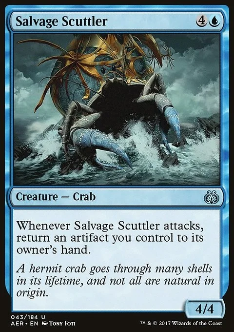 Whenever Salvage Scuttler attacks, return an artifact you control to its owner's hand.