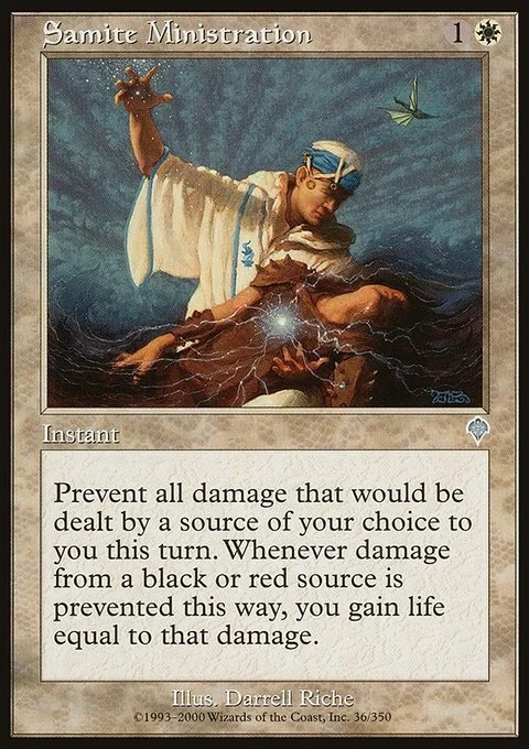 Prevent all damage that would be dealt to you this turn by a source of your choice. Whenever damage from a black or red source is prevented this way this turn, you gain that much life.