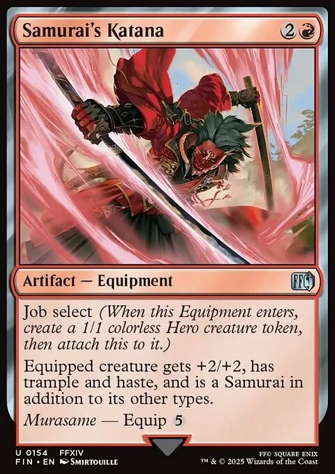 Job select (When this Equipment enters, create a 1/1 colorless Hero creature token, then attach this to it.) Equipped creature gets +2/+2, has trample and haste, and is a Samurai in addition to its other types. Murasame — Equip {5}