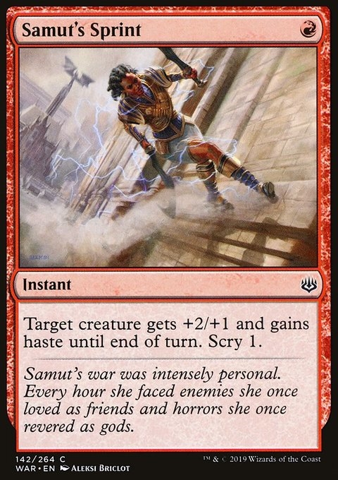 Target creature gets +2/+1 and gains haste until end of turn. Scry 1.