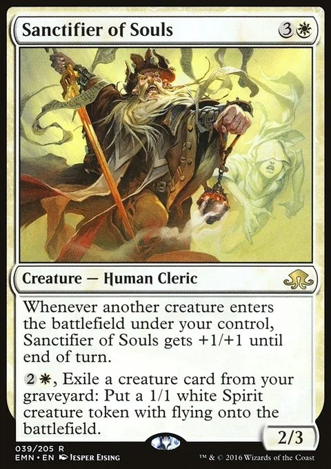Whenever another creature enters the battlefield under your control, Sanctifier of Souls gets +1/+1 until end of turn. {2}{W}, Exile a creature card from your graveyard: Create a 1/1 white Spirit creature token with flying.