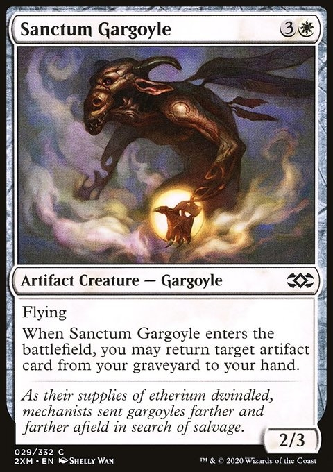 Flying When Sanctum Gargoyle enters the battlefield, you may return target artifact card from your graveyard to your hand.
