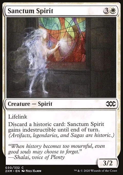 Lifelink Discard a historic card: Sanctum Spirit gains indestructible until end of turn. (Artifacts, legendaries, and Sagas are historic.)