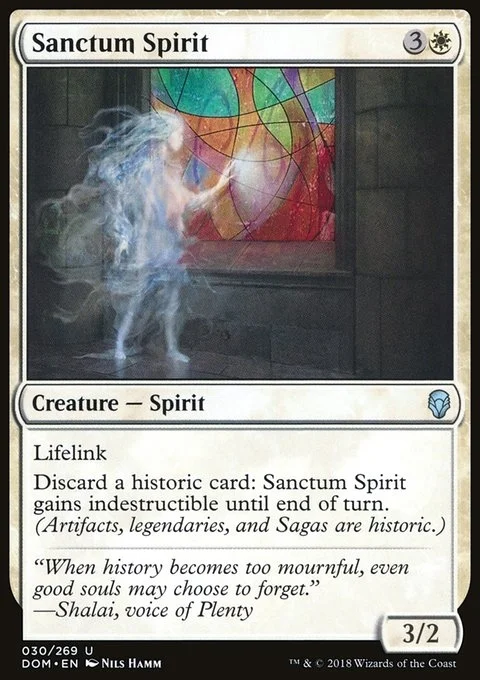Lifelink Discard a historic card: Sanctum Spirit gains indestructible until end of turn. (Artifacts, legendaries, and Sagas are historic.)