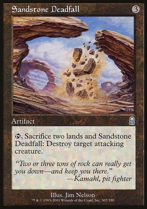 {T}, Sacrifice two lands and Sandstone Deadfall: Destroy target attacking creature.