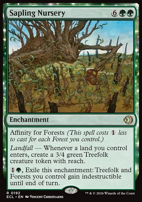 Landfall — Whenever a land you control enters, create a 3/4 green Treefolk creature token with reach.