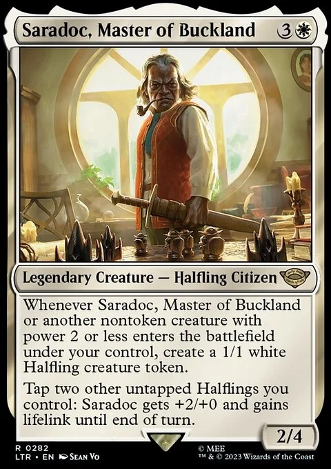 Whenever Saradoc, Master of Buckland or another nontoken creature with power 2 or less enters the battlefield under your control, create a 1/1 white Halfling creature token.