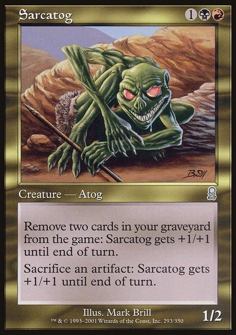 Exile two cards from your graveyard: Sarcatog gets +1/+1 until end of turn. Sacrifice an artifact: Sarcatog gets +1/+1 until end of turn.