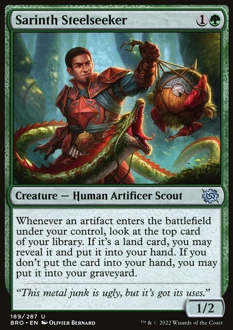 Whenever an artifact enters the battlefield under your control, look at the top card of your library. If it's a land card, you may reveal it and put it into your hand. If you don't put the card into your hand, you may put it into your graveyard.