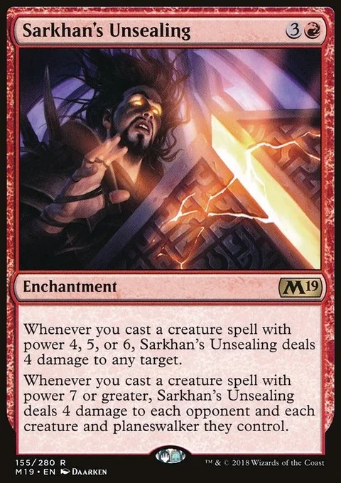 Whenever you cast a creature spell with power 7 or greater, Sarkhan's Unsealing deals 4 damage to each opponent and each creature and planeswalker they control.