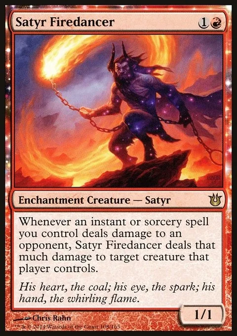 Whenever an instant or sorcery spell you control deals damage to an opponent, Satyr Firedancer deals that much damage to target creature that player controls.