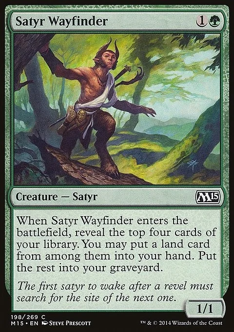 When Satyr Wayfinder enters the battlefield, reveal the top four cards of your library. You may put a land card from among them into your hand. Put the rest into your graveyard.