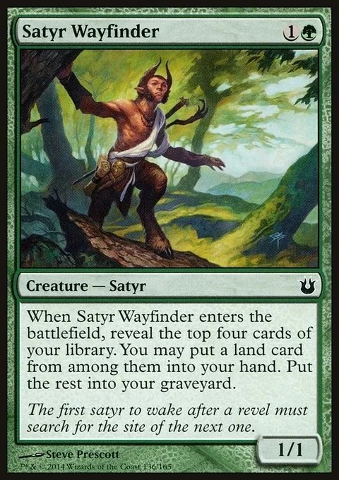 When Satyr Wayfinder enters the battlefield, reveal the top four cards of your library. You may put a land card from among them into your hand. Put the rest into your graveyard.