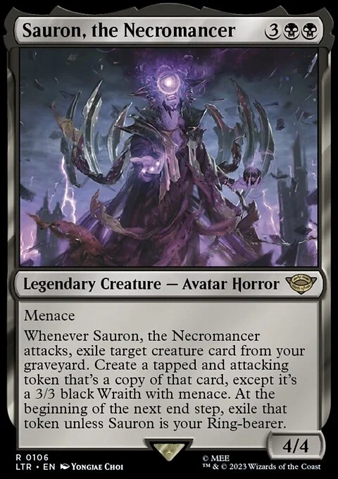 Whenever Sauron attacks, exile target creature card from your graveyard. Create a tapped and attacking token that's a copy of that card, except it's a 3/3 black Wraith with menace. At the beginning of the next end step, exile that token unless Sauron is your Ring-bearer.