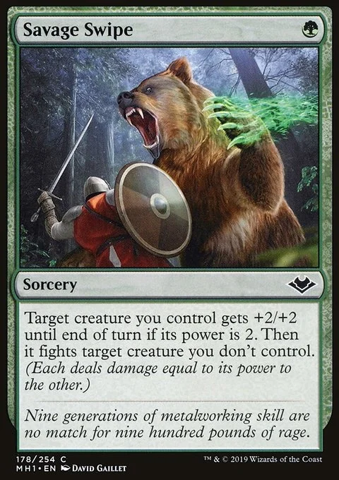 Target creature you control gets +2/+2 until end of turn if its power is 2. Then it fights target creature you don't control. (Each deals damage equal to its power to the other.)