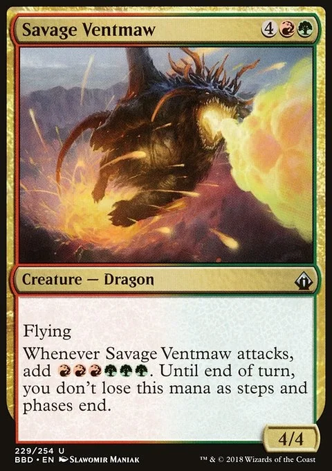 Flying Whenever Savage Ventmaw attacks, add {R}{R}{R}{G}{G}{G}. Until end of turn, you don't lose this mana as steps and phases end.