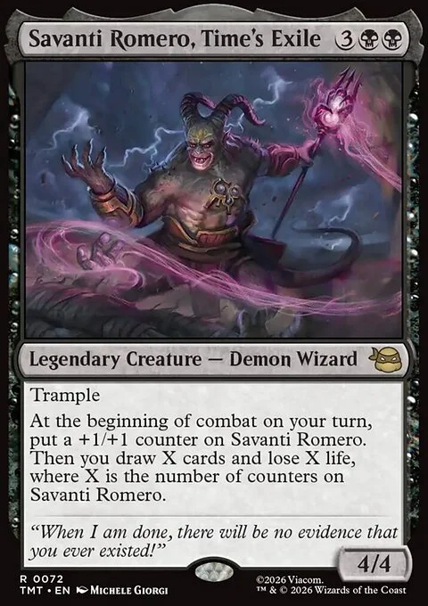 Trample At the beginning of combat on your turn, put a +1/+1 counter on Savanti Romero. Then you draw X cards and lose X life, where X is the number of counters on Savanti Romero.