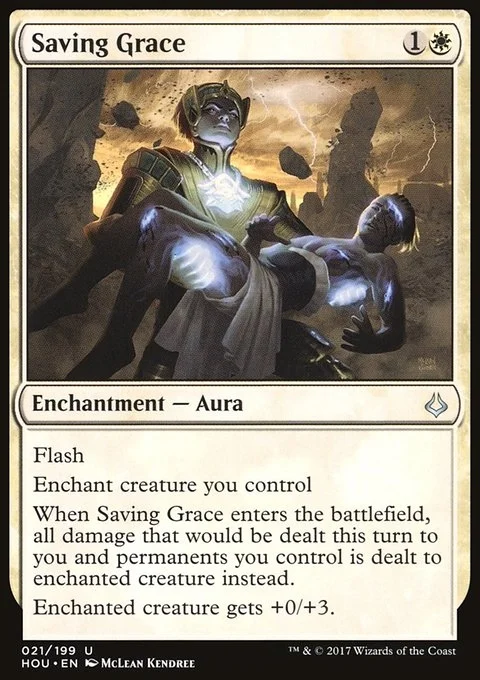Flash Enchant creature you control When Saving Grace enters the battlefield, all damage that would be dealt this turn to you and permanents you control is dealt to enchanted creature instead. Enchanted creature gets +0/+3.