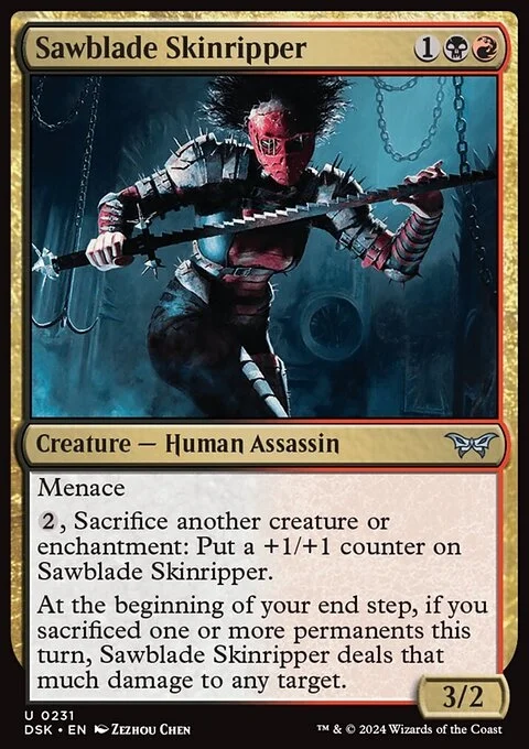 Menace {2}, Sacrifice another creature or enchantment: Put a +1/+1 counter on Sawblade Skinripper. At the beginning of your end step, if you sacrificed one or more permanents this turn, Sawblade Skinripper deals that much damage to any target.