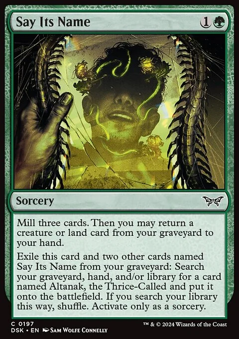 Exile this card and two other cards named Say Its Name from your graveyard: Search your graveyard, hand, and/or library for a card named Altanak, the Thrice-Called and put it onto the battlefield. If you search your library this way, shuffle. Activate only as a sorcery.