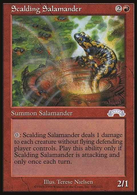 0: Scalding Salamander deals 1 damage to each creature without flying defending player controls. Play this ability only if Scalding Salamander is attacking and only once each turn.