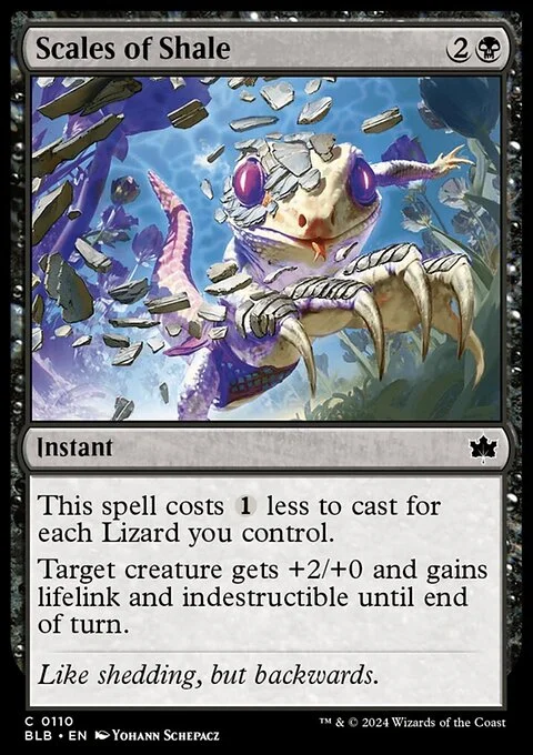 Affinity for Lizards (This spell costs {1} less to cast for each Lizard you control.) Target creature gets +2/+0 and gains lifelink and indestructible until end of turn.