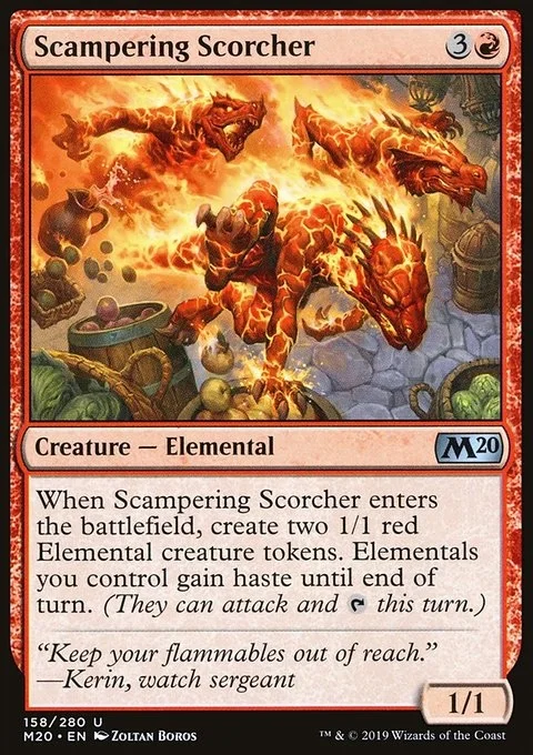 When Scampering Scorcher enters the battlefield, create two 1/1 red Elemental creature tokens. Elementals you control gain haste until end of turn. (They can attack and {T} this turn.)