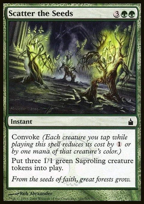 Convoke (Your creatures can help cast this spell. Each creature you tap while casting this spell pays for {1} or one mana of that creature's color.) Create three 1/1 green Saproling creature tokens.