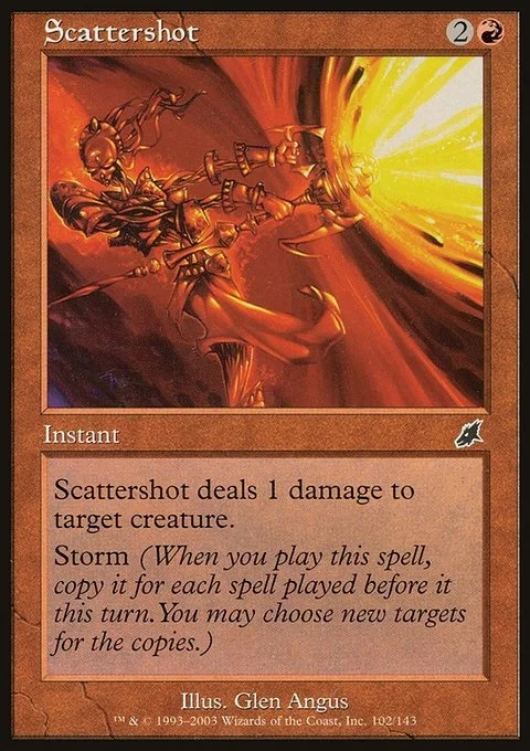 Scattershot deals 1 damage to target creature. Storm (When you cast this spell, copy it for each spell cast before it this turn. You may choose new targets for the copies.)