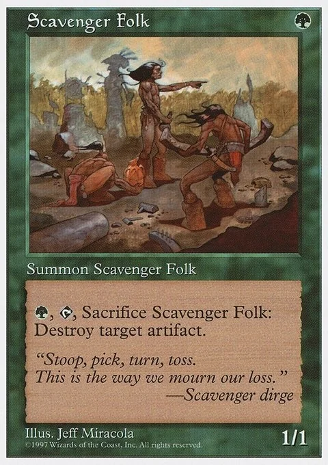 {G}, {T}, Sacrifice Scavenger Folk: Destroy target artifact.