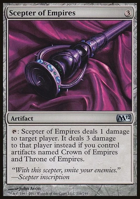 {T}: Scepter of Empires deals 1 damage to target player or planeswalker. It deals 3 damage instead if you control artifacts named Crown of Empires and Throne of Empires.