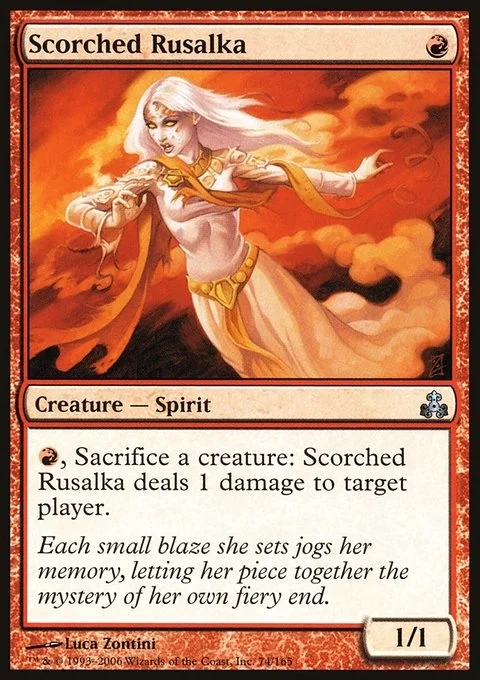 {R}, Sacrifice a creature: Scorched Rusalka deals 1 damage to target player or planeswalker.