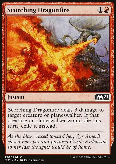 Scorching Dragonfire deals 3 damage to target creature or planeswalker. If that creature or planeswalker would die this turn, exile it instead.