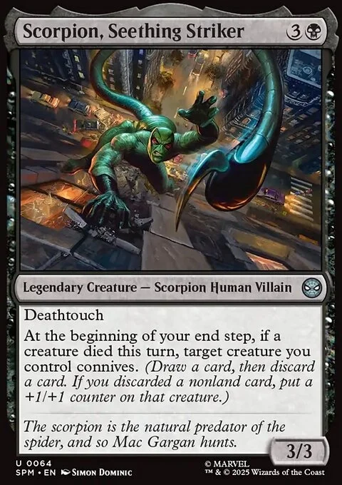 Deathtouch At the beginning of your end step, if a creature died this turn, target creature you control connives. (Draw a card, then discard a card. If you discarded a nonland card, put a +1/+1 counter on that creature.)