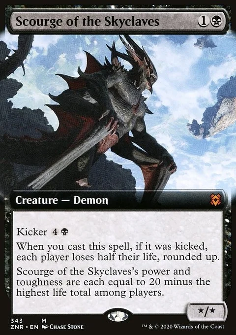 Kicker {4}{B} When you cast this spell, if it was kicked, each player loses half their life, rounded up. Scourge of the Skyclaves's power and toughness are each equal to 20 minus the highest life total among players.