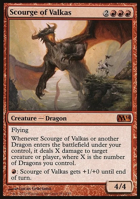 Flying Whenever this creature or another Dragon you control enters, it deals X damage to any target, where X is the number of Dragons you control. {R}: This creature gets +1/+0 until end of turn.