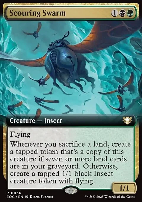 Flying Whenever you sacrifice a land, create a tapped token that's a copy of this creature if seven or more land cards are in your graveyard. Otherwise, create a tapped 1/1 black Insect creature token with flying.