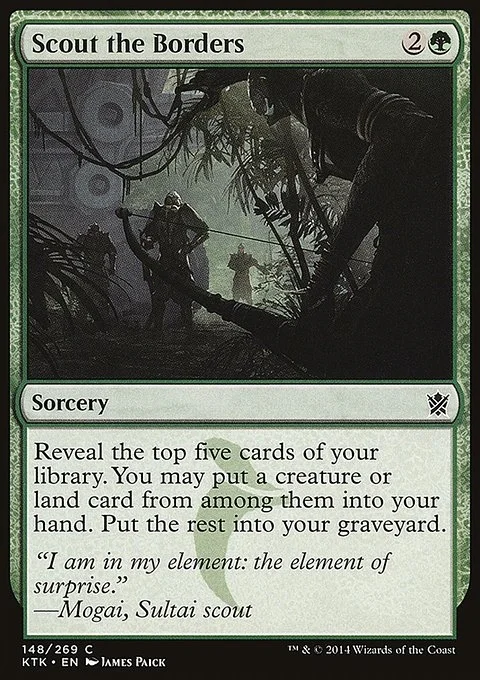Reveal the top five cards of your library. You may put a creature or land card from among them into your hand. Put the rest into your graveyard.