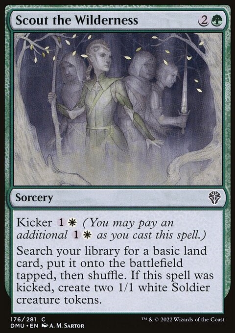 Kicker {1}{W} (You may pay an additional {1}{W} as you cast this spell.) Search your library for a basic land card, put it onto the battlefield tapped, then shuffle. If this spell was kicked, create two 1/1 white Soldier creature tokens.